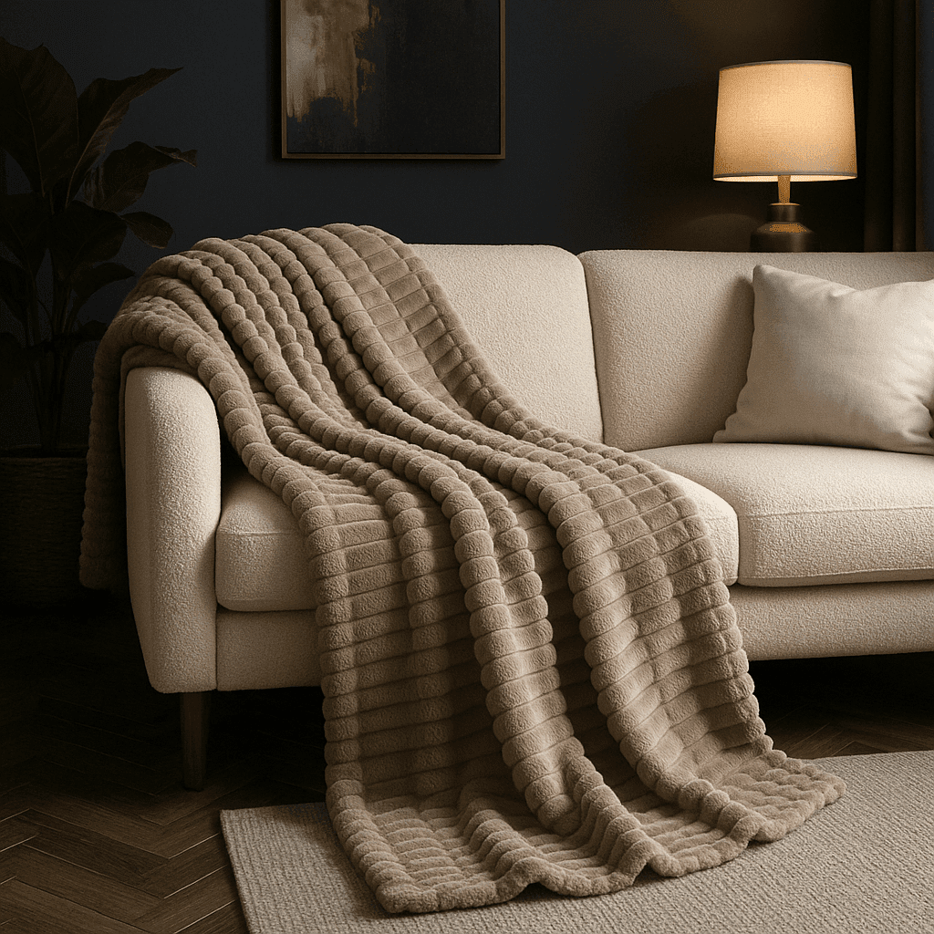 Koc pluszowy w grube prążki beżowy 160x200
