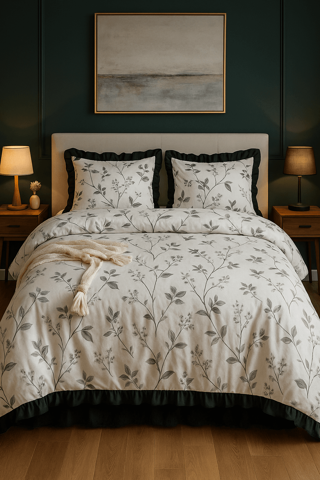 Pościel 3 częściowa we wzory w szare kwiaty z falbanami