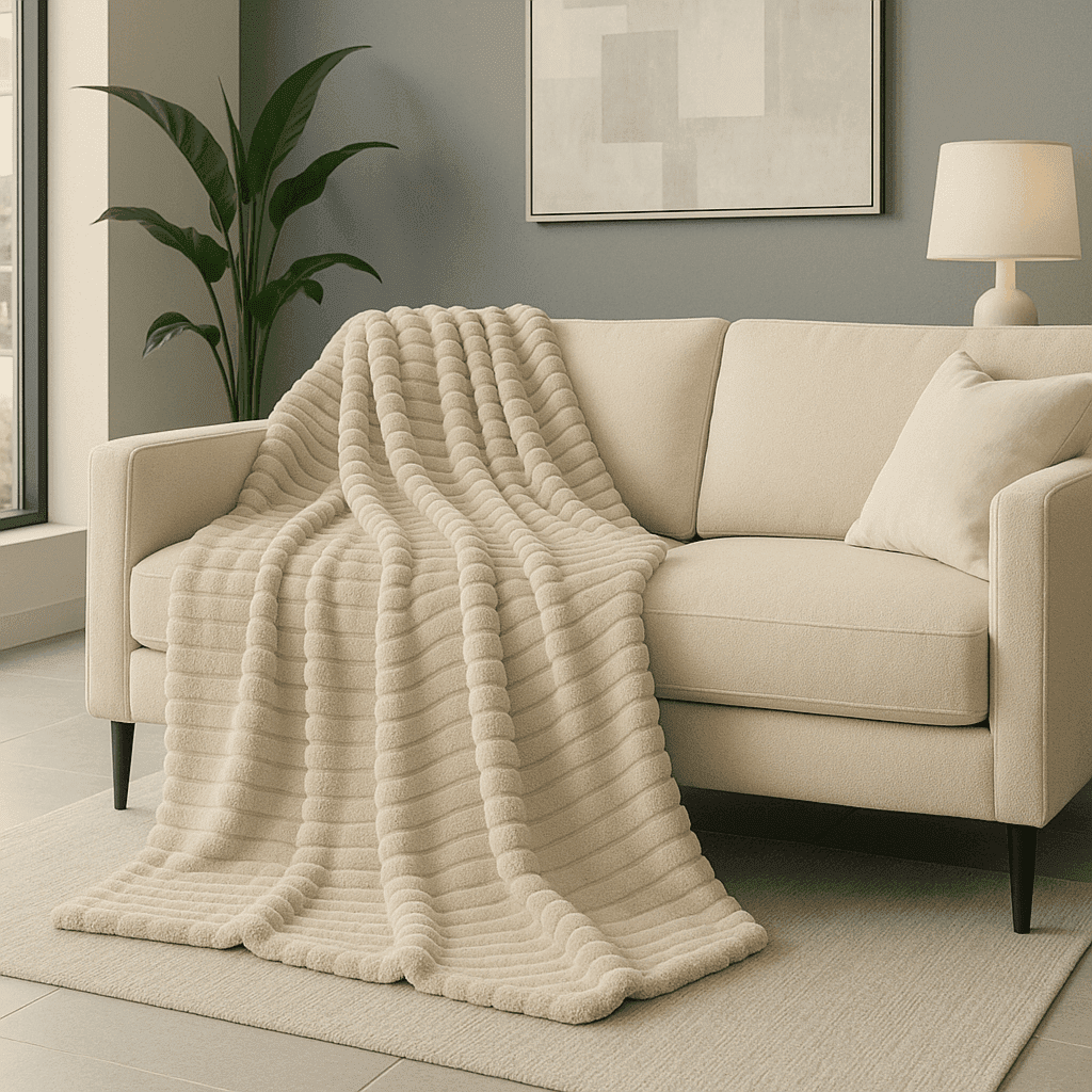 Koc pluszowy w grube prążki beżowy 160×200 – miękki, elegancki i ciepły. Idealny do salonu i sypialni, wprowadza przytulny klimat i stylową harmonię.