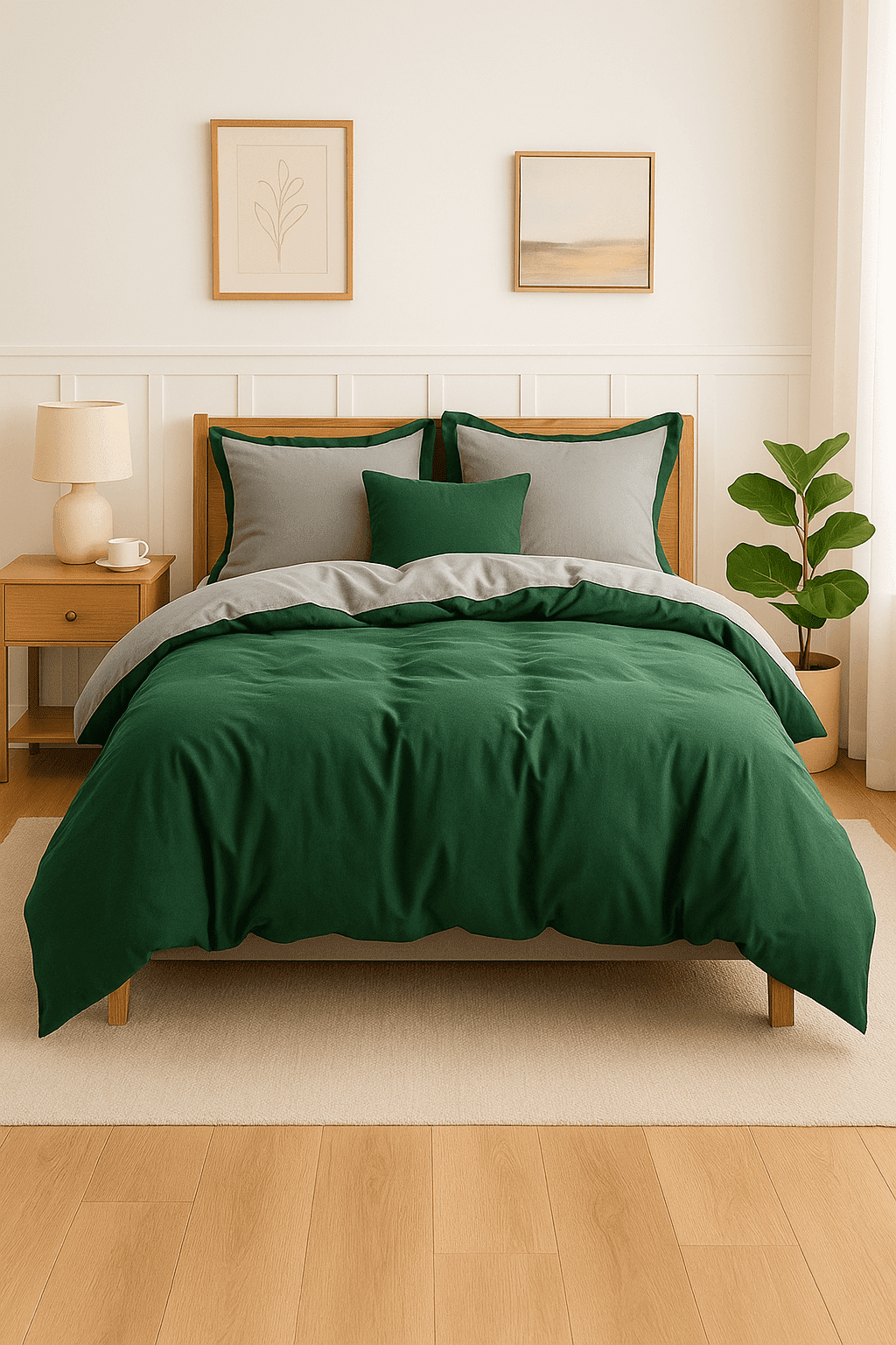 Pościel 3 częściowa dwukolorowa zielono-jasnoszara – elegancki komplet z bawełny. Stylowe połączenie kolorów, które nadaje sypialni świeżości i przytulności.
