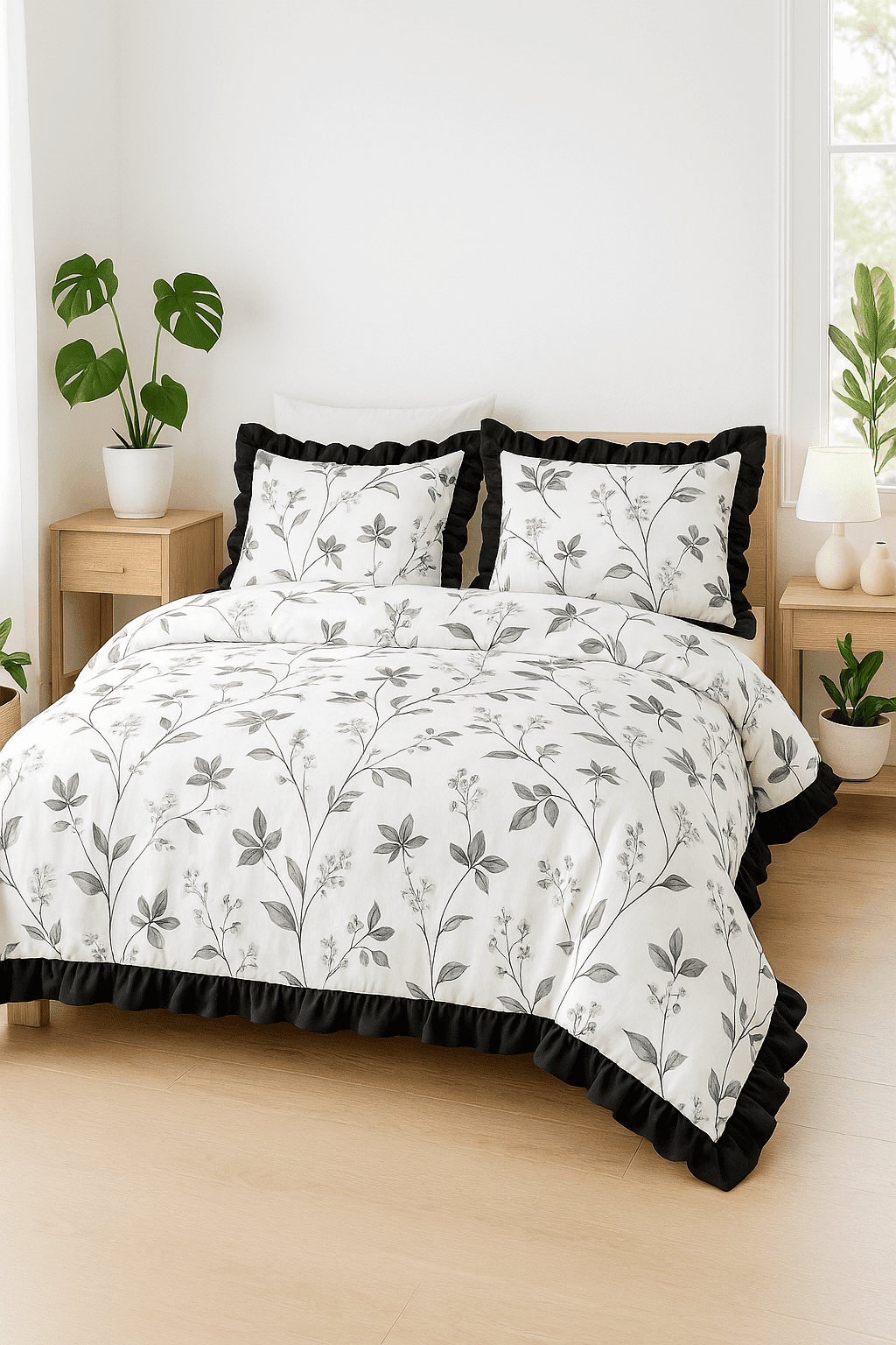 Ta elegancka pościel w subtelny roślinny wzór to idealne połączenie klasyki i nowoczesności. Jasne tło z delikatnymi szarościami sprawia, że zestaw wprowadza do sypialni świeżość, a czarne falbanki dodają mu wyjątkowego charakteru i wyrazistego akcentu dekoracyjnego.